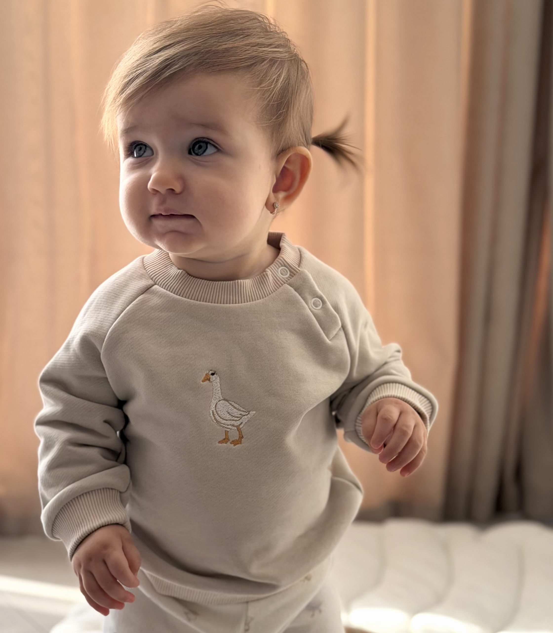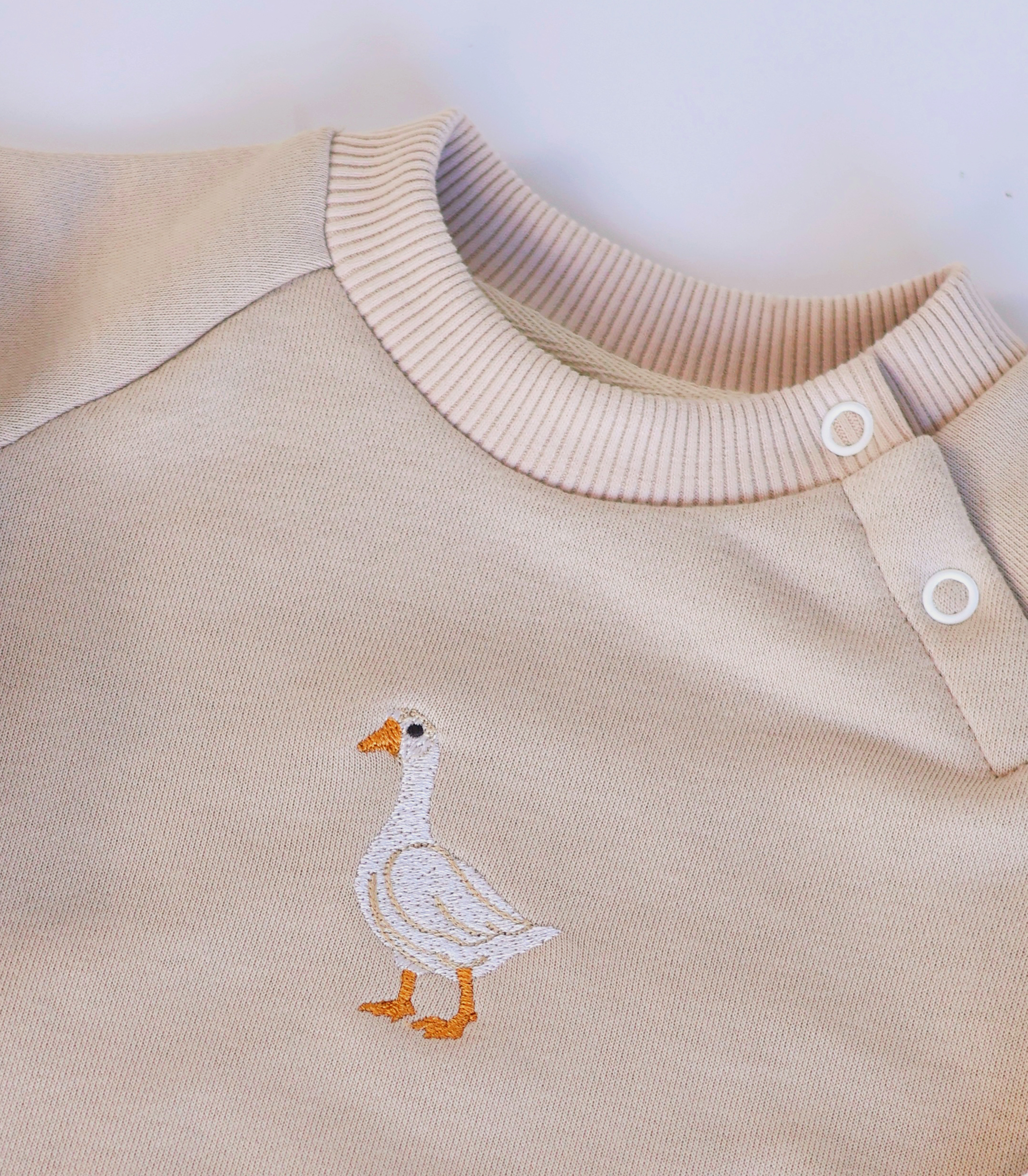Світшот має вільний крій, м’яку еластичну горловину та кнопки на плечі для легкого одягання. Декорований милою вишивкою, що додає образу особливого шарму.