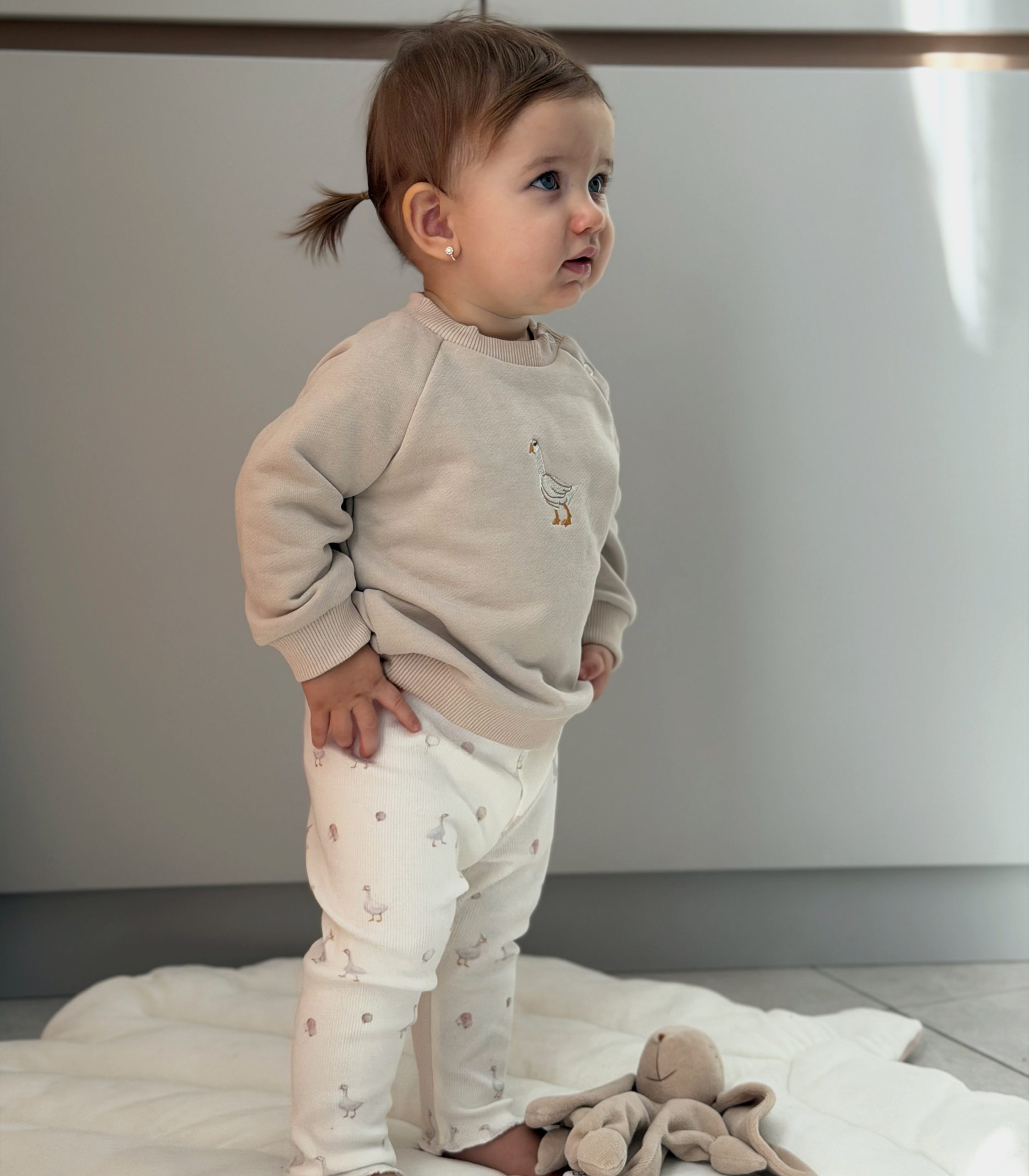 Ніжний та стильний костюм для найменших, який ідеально підійде для щоденних прогулянок, дому чи в гості. Комплект складається зі зручного світшота та м’яких легінсів, виконаних у спокійній натуральній гамі.