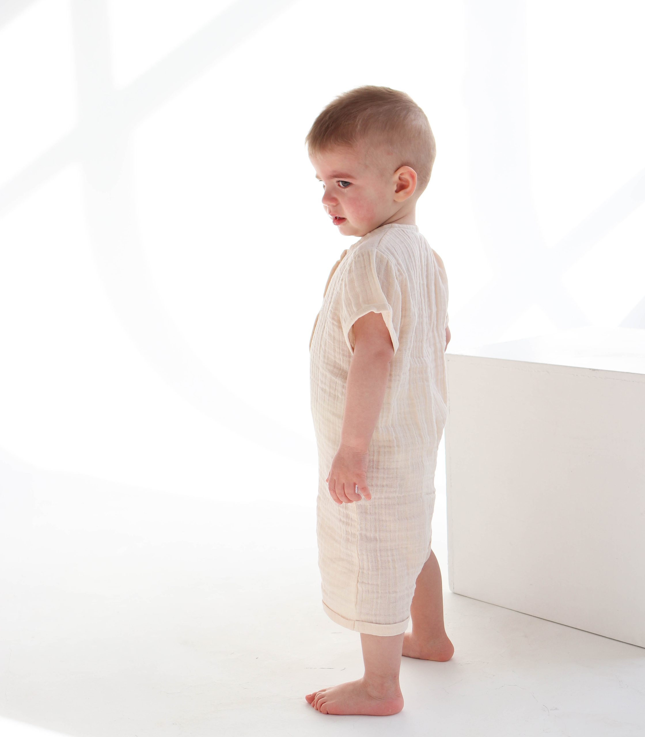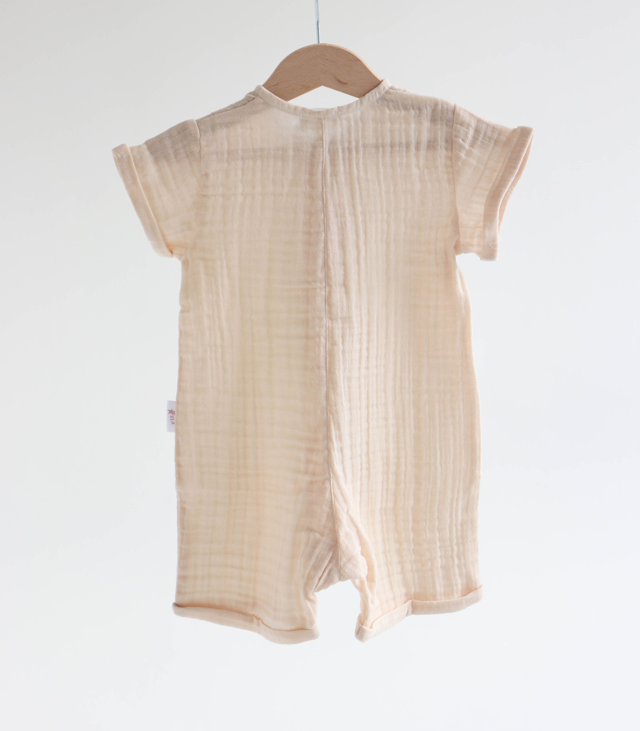 Легкий, дихаючий і надзвичайно м’який до тіла, цей ромпер створений спеціально для комфорту малюків з перших днів життя до 2 років. Натуральний муслін добре пропускає повітря, не перегріває шкіру дитини і водночас захищає її від сонця.